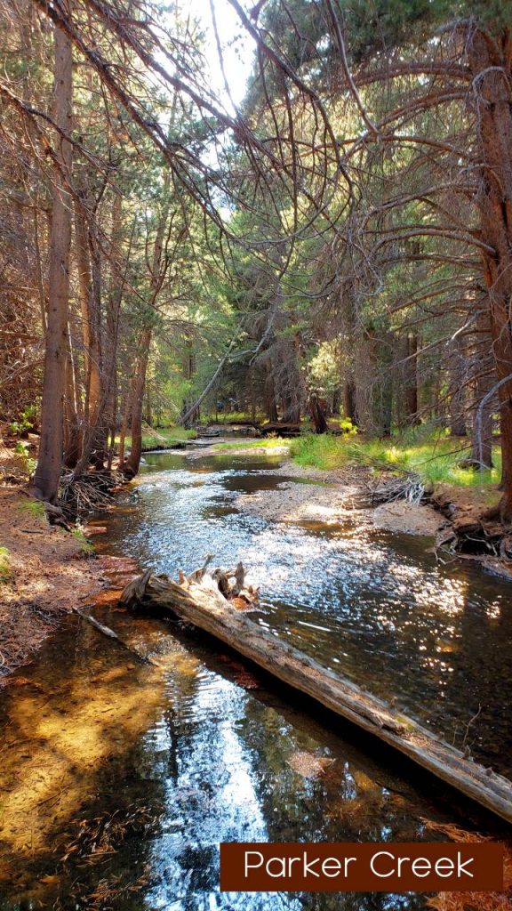 The Parker Lake trail leads you directly into the Ansel Adams Wilderness rather quickly and because of the heat of the mid day sun the initial climb up from the parking area was a bit or a grueller, especially with tired legs already from our earlier hike. This hike say sit is a moderate 3.7 mile out and back hike with 650 feet elevation gain. That first mile however is where all the work is for the hike. After that this is a very pleasant hike along Parker creek. The fall colors were popping on this hike and it was a beautiful afternoon as we strolled rather quickly along the creek and through a multitude of aspen trees and large ponderosa trees. A few stops along the creek for a breathers and just to take in the scenic value of the creek itself before one last push thought he trees to the edge of Parker Lake. Parker Lake trail does not make the list of Mono county Fall Color hikes but we can tell you if you want a great hike, beautiful lake and fall colors, this is a really good choice.