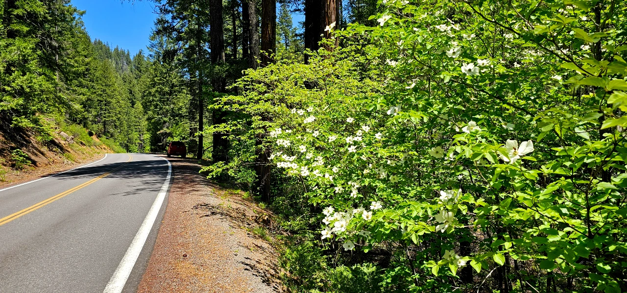Afterward, we drove upstream along Highway 32 to Deer Creek Falls, a spectacular 100-foot plunge over a volcanic cliff. With mist in the air and the sun breaking through the trees, it felt like a hidden paradise. Every sense was engaged: birdsong above, rushing water below, and the earthy scent of pine needles. After a few short stops for the dogwoods along the roadside, this adventure trip needed to come to a close and we headed back.