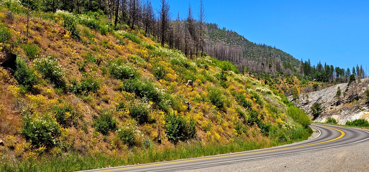 Leaving the valley behind later that day, I wound my way north of Reno on Highway 70 through the Feather River Canyon—a corridor that always feels like a passage into something sacred. This time, the canyon walls were blanketed in vibrant wildflowers. Purples, oranges, and brilliant yellows spilled down the slopes, fed by spring runoff and framed by the rich green of new growth. As I turned onto Highway 89 and entered Indian Valley, the memory of the Dixie Fire came flooding back. Charred black tree trunks rose like silent sentinels from a landscape now pulsing with renewal. Beneath the skeletal remains of the forest, a lush green carpet had returned. Yellow blooms stretched toward the sun, and deer grazed casually along the roadside. There is something emotional—almost spiritual—about watching life reclaim a space that had been so scarred.