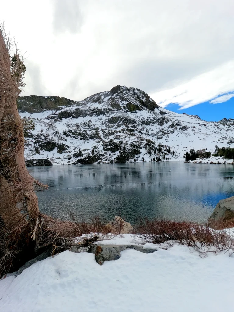 Winnemucca Lake is stunning in winter. At this time, ice covered 80% of the lake in a transparent sheet that did not look very thick. Water lapped at the ice near the Eastern Shore and in the center. Snow covered the crevasses of Round Top Peak and most of the rocky terrain around the lake, making the border of the lake a little easier to travel.