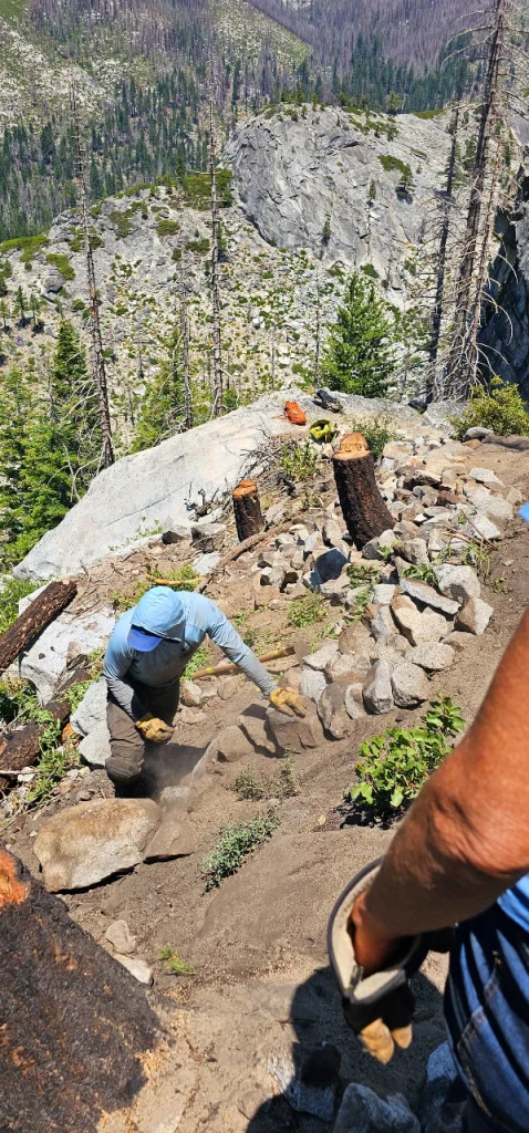 In the heat of a summer day, we hauled and broke rocks, sculpted new trail tread, and stabilized eroded terrain at the base of one of the most iconic climbing zones in the Sierra. The work is part of a larger initiative to rebuild this area after the wildfire scars of recent years—an effort not just to repair trails, but to reclaim a community space.