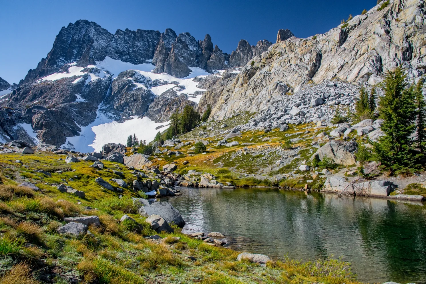 The trail continues along Ediza Lake before beginning the approximate 500 foot elevation gain over the 1.5 mile trek from Ediza to Iceberg Lake. My excitement climaxed upon reaching Iceberg Lake, unexpectedly becoming the highlight of the day. I immediately noticed the lake had already began freezing, and the turquoise ascents of the lake were aggrandized by the abundance of sunshine. I’ve always loved the Minarets, some of my favorite peaks in the High Sierra, and the minarets tower over the lake in dramatic fashion.