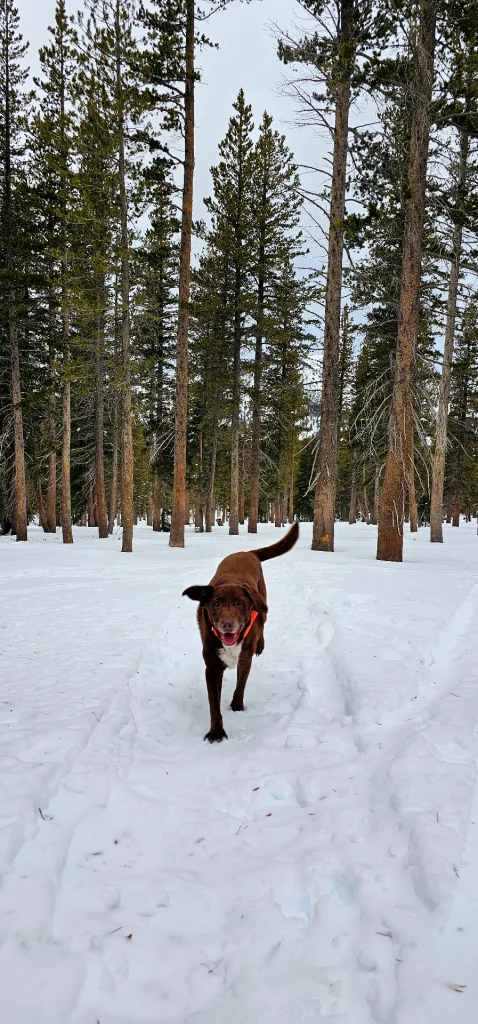 As we headed back down towards the car, we continued to follow Dakota as she wandered back into the Snow for a bit and then back to the trail. She enjoyed the open space and didn’t mind the other dogs running with their skiing owners headed up the hill. Finding a place not at war with Dogs or dog owners is undoubtedly lovely. I hope all dog owners will appreciate and help keep it a friendly Dog zone by maintaining respect on the trail and cleaning up after their pets.