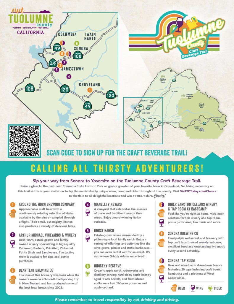 Sip your way from Sonora to Yosemite on the Tuolumne County Craft Beverage Trail presented by Visit Tuolumne County! Raise a glass to the past near Columbia State Historic Park or grab a growler of your favorite brew in Groveland! *No hiking necessary on this Tuolumne County trail. And there are potential Prizes: