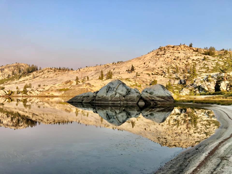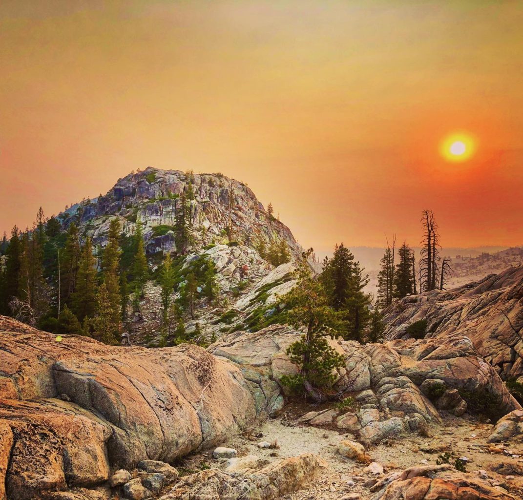 With our GPS and good sense of direction, we made our way up to Pingree Lake and enjoyed its cool water as the smoke from nearby wildfires closed in. As the smoke gradually began to thicken, we decided to make our way down towards Rosasco Lake for the night. Donning neck gaiters over our faces, we followed a horse trail down to what we thought was our trail intersection, but we were wrong! We inadvertently found an unmarked “trail” that would ultimately lead back to the Bell Meadow trail, but that wasn’t in our plan so we backtracked. Luckily we found our original route and headed over to Rosasco Lake, only to find a large group of campers with some aggressively barking dogs at the only viable site. Wanting more privacy, we ventured along to a small tarn just below the lake and found a great spot for our tent. We soaked our tired feet in the cold water and happily ate our dinner.