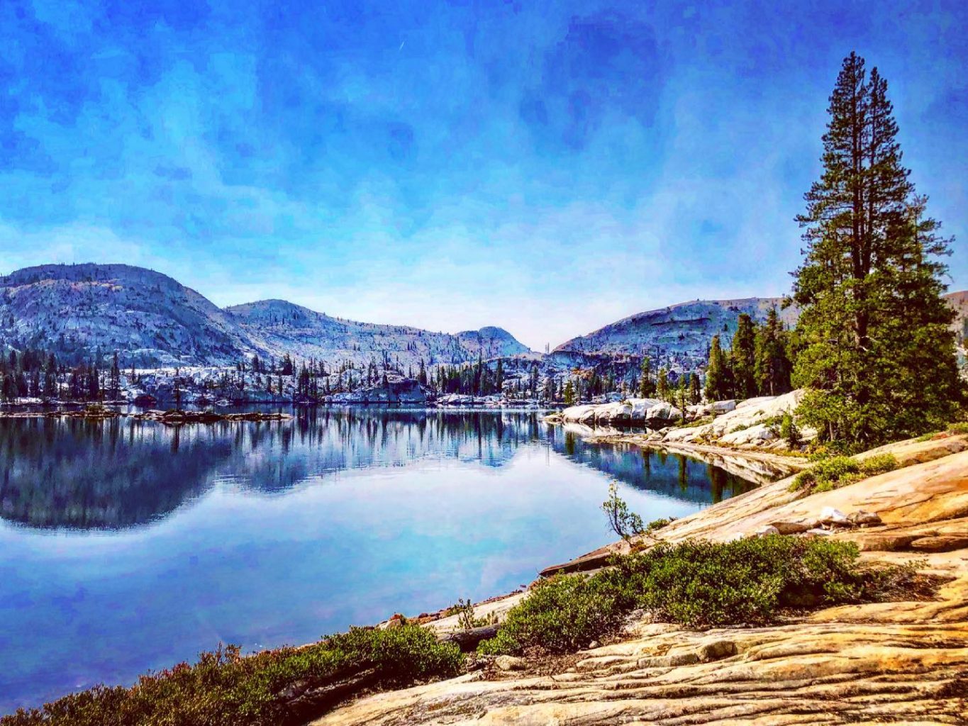 After a restful night, we hiked up the rocks to perhaps our favorite part of the trip. Referred to as the granite superhighway, there is this giant, smooth granite bowl between Hyatt and Big Lakes that empties into Cherry Creek Canyon. We stood in awe of the immensity of the “bowl”. After taking a ton of photos that wouldn’t do it any justice, we skirted around the upper flanks to a notch where our route would take us over to Big Lake. Climbing up the boulders, we were amazed to see horse poop, a sign that they too ventured along this steep path.