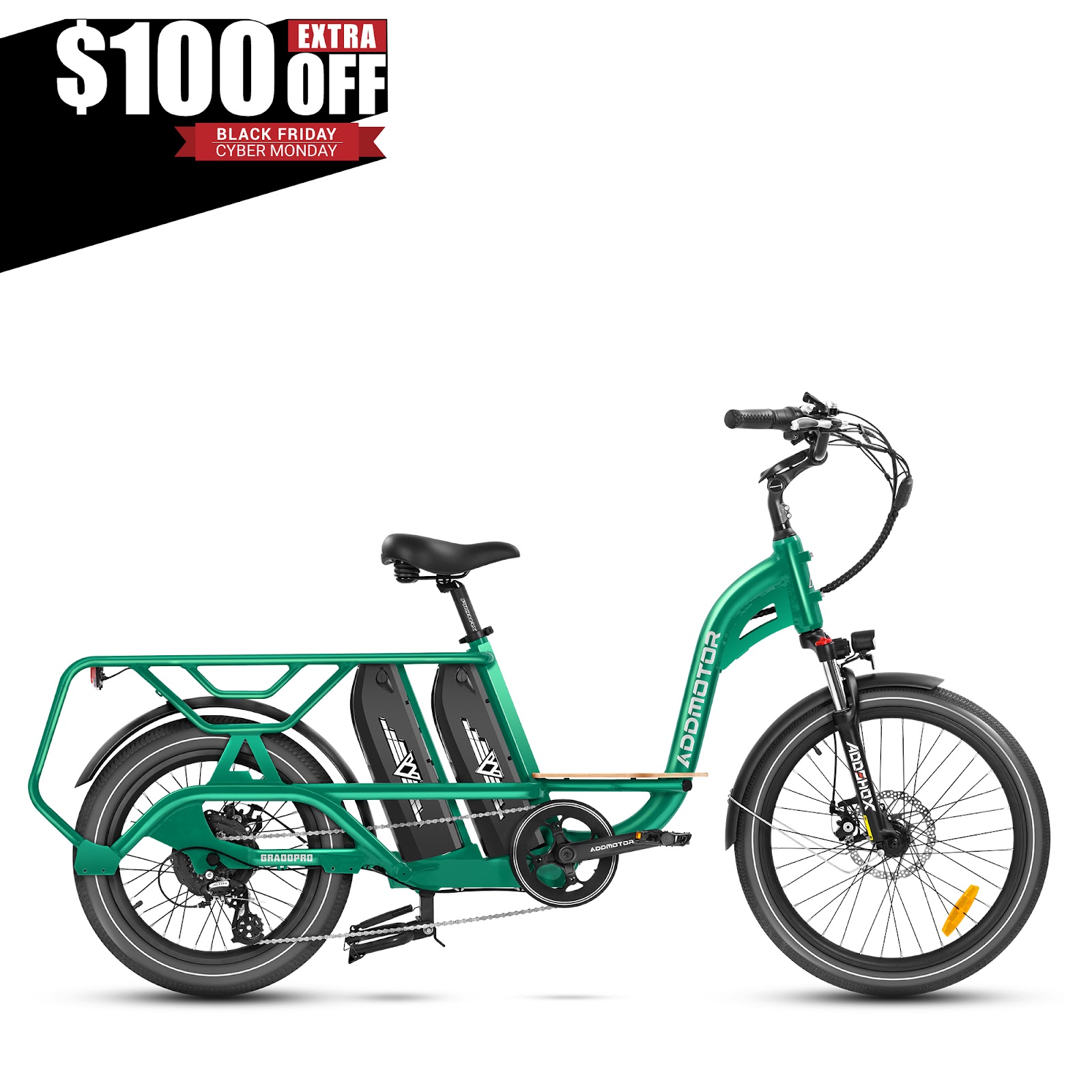 You’ll get $100 off the Addmotor GRAOOPRO Dual Battery Cargo Ebike at upcoming Black Friday deals. It’s a huge discount that you should never miss if you’re looking for a versatile and reliable e-bike.