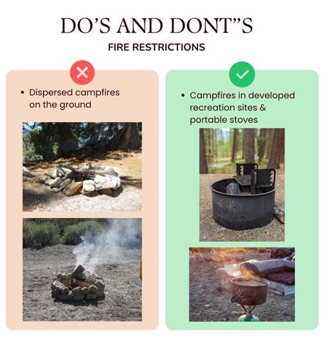 - No campfires, charcoal BBQs, or stove fires outside of developed campgrounds with agency-provided fire rings.