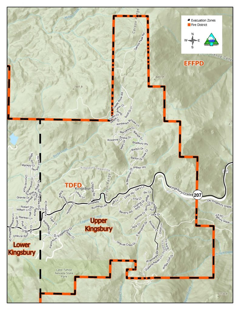 The evacuation warnings will include areas from Highway 50 at Lake Parkway, east to Elks Point road (Excluding Stateline Casinos, State Route 50 to Tramway Drive, including all areas North and South of Kingsbury grade.