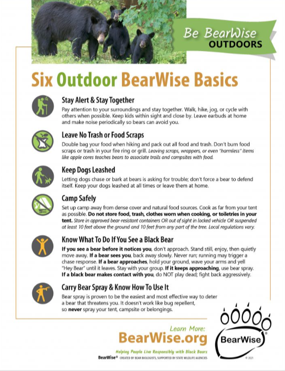 Bearwise.org offers a wealth of information on black bear biology and behavior as well as sections on preventing human-bear conflicts at home and outdoors, including vacationing in bear country, bear safety information, guidelines for raising livestock, bees and crops, tips for dog owners and bird lovers, helpful FAQs, and information about how neighborhoods, communities and businesses can put BearWise to work.