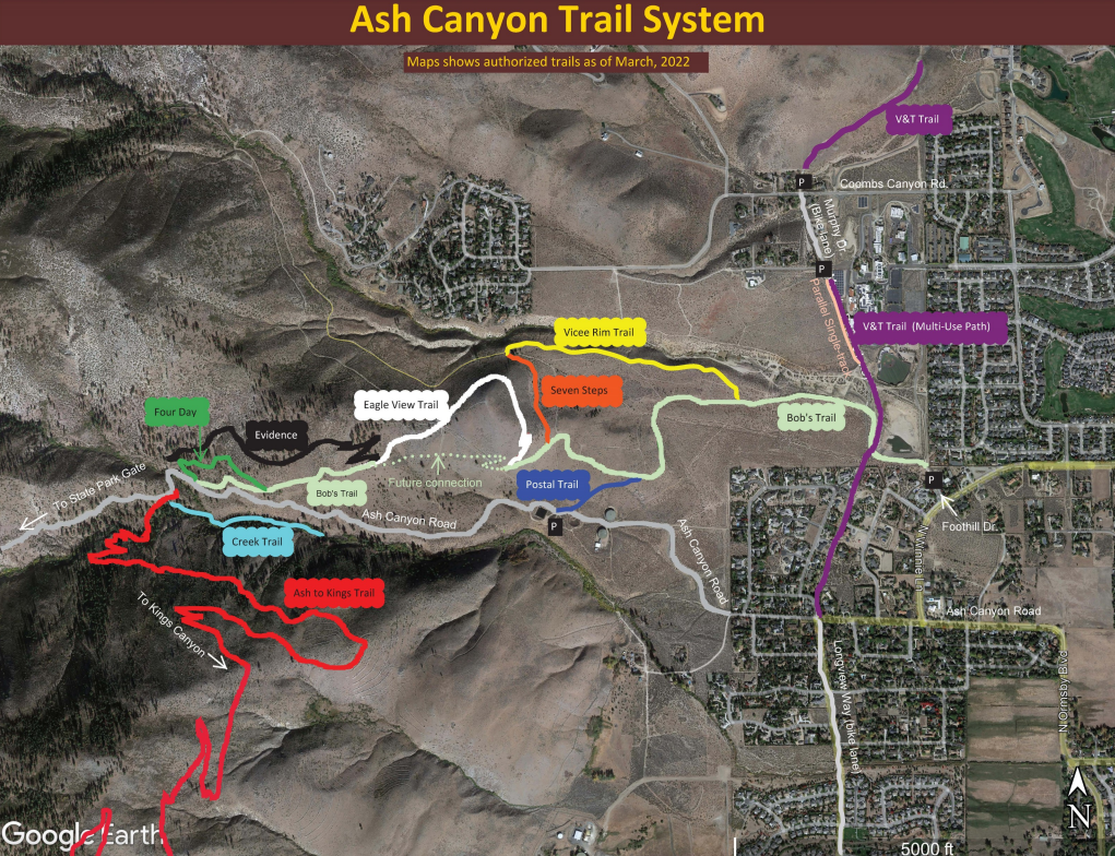 Location of Trail: The New trail segment is between the Kings Canyon Trail Network and the Ash Canyon Trail Network. Recommended Route is via the Kings Canyon system using the Lincoln Bypass route as a starting point, but the trail can be accessed from either direction on the Kings to Ash trail above the West Hills of Carson City