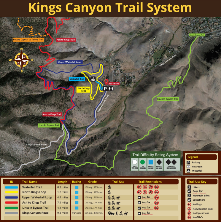 Start at Lincoln Bypass Trail off Kings Canyon Road. The Lincoln bypass trail is a newer section of trail completed in 2021 by Sierra Trail Works & Muscle Powered. It provides riders a mellower route and will connect riders to the Kings to Ash Canyon trail and then to the Capitol to Tahoe Trail, leading travelers to Laxal Flat above Marlette Lake between Hobart Lake and Marlette Lake. Travelers can then travel down the Marlette Lake Road into Spooner State Park or turn North at the Lake to connect with the Flume Trail or the Marlette Creek Trail. (It is important to note that at this time, 2 miles of the trail are still being finished near Laxalt Flats, so riders today are being redirected via the Snow Valley Road into Spooner State Park until the trail is complete.