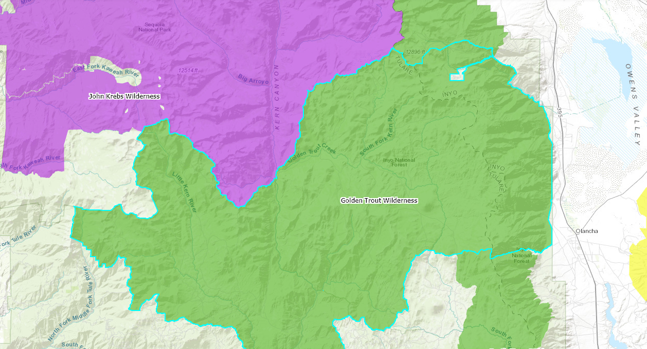 The Golden Trout has supported native populations of golden trout (California’s state fish) for thousands of years in the drainages of the Upper Kern River. This wilderness contains all of the Little Kern River’s drainage as well as the North and South Fork of the Kern River plus 117 miles of streams; the Golden Trout Wilderness is a true trout haven.
