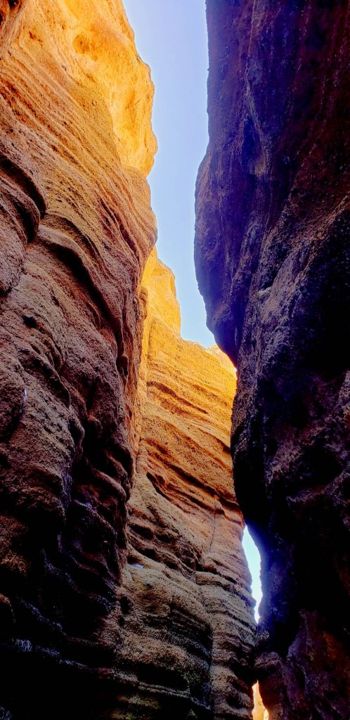 The slots / fissures in this region range from 20 feet to 50 feet into the earth with passage ways ranging from a foot to 10 feet in width. The surface is carved with wind and water making for fascinating ripples in the walls and small cavities that capture the light and darkness through out the hike. the Largest fissure has multiple sections where elevation and width change dramatically and the opening above changing directions giving you a great sky line to photograph or look up to. It eventually opens out to the side of a plateau overlooking the Wilson and Mill Creek valley below.