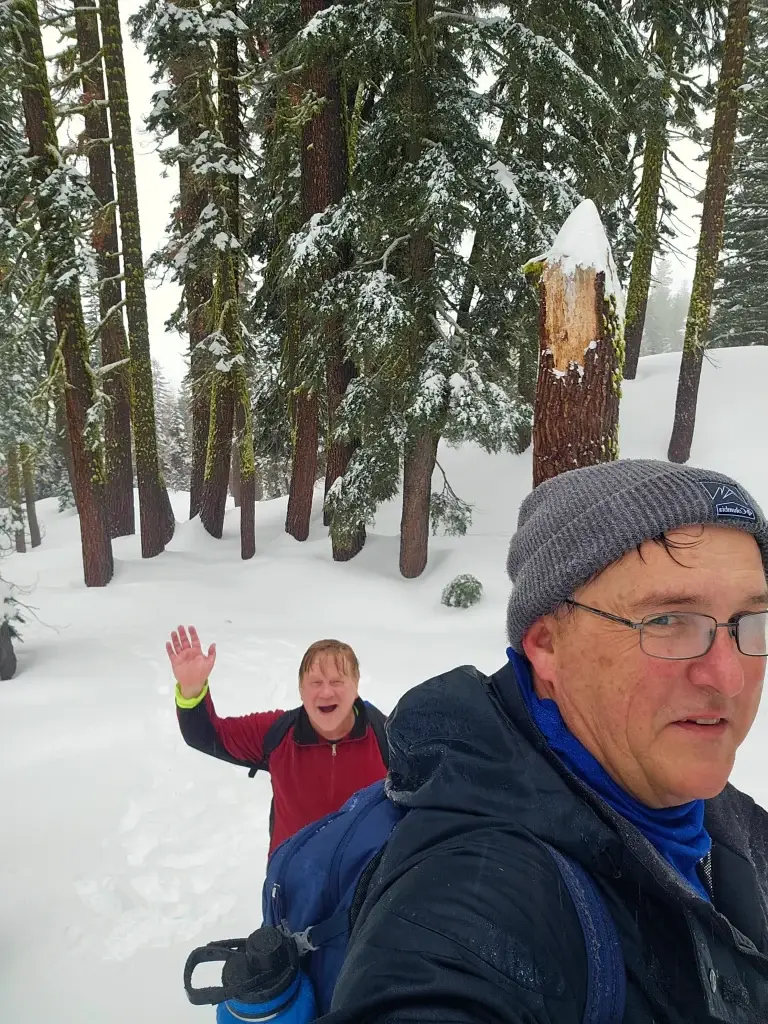 Arriving at the Kohm Yah-mah-nee Visitor Center, we found a modest gathering of about 10 cars. The lodge itself was closed for the holiday, but that didn’t dampen our spirits. We layered up—my new merino wool base layer proving invaluable against the damp chill—and strapped on our snowshoes.