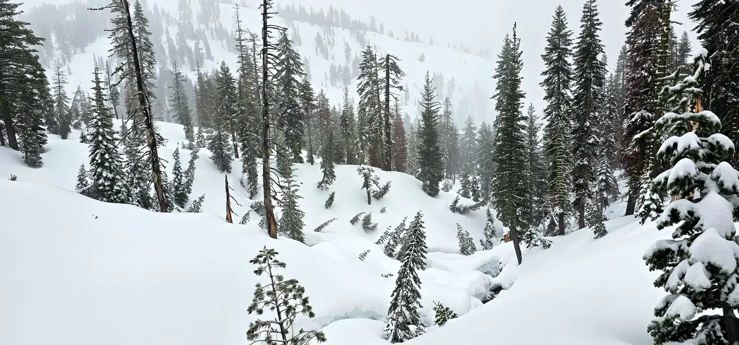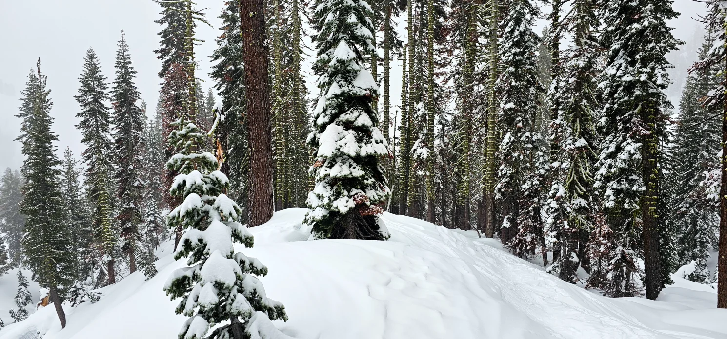 The climb to Ridge Lakes is a moderately challenging trek, ascending about 1,000 feet in just over a mile. Without the skiers’ tracks, I might have been lost—a humbling reminder that tools like maps and GPS apps are useless if you forget to prepare them in advance! The trail wound through a gorgeous canyon, flanked by creek beds and ridges adorned with snow-draped white pines, hemlocks, and sugar pines. The interplay of green moss, snowy drifts, and the decay of fallen trees created a tableau of natural resilience and beauty.