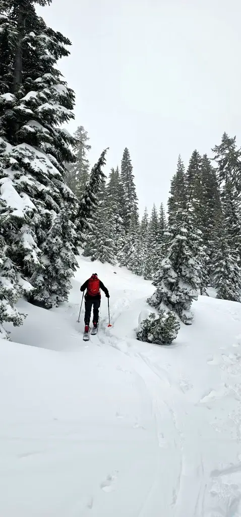 Halfway up, we encountered a young family teaching their son to snowboard in the backcountry. Their determination was admirable, though the oversized board and a touch of fear made progress slow. A passing skier assured us the climb was worth it, but as the trail steepened and the wet snow soaked through our layers, I began to question the wisdom of continuing. The looming cornices above and the potential for avalanches finally tipped the scales. Reluctantly, we decided to turn back.