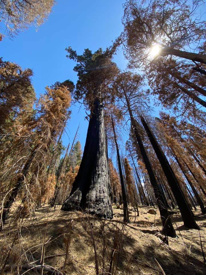 | Dr. Brigham, an expert on giant sequoias, ranks the threats to giant sequoias in terms of urgency and scale/scope as follows: (1) loss of monarch old-growth trees to high-severity fires such as in the Castle Fire; (2) loss of monarch old-growth giant sequoias to drought and fire-mediated cedar bark beetle attack. Trees weakened by previous fire and current drought are vulnerable as never before to attack and death by native cedar bark beetles; and (3) giant sequoias killed directly by climate change impacts such as drought. As droughts become more frequent, it may become so dry that giant sequoias are directly killed by drought and may only persist in small pockets of appropriate microclimate. Giant sequoias have survived many previous droughts and changes in climate, but we are concerned that the pace and scale of human-caused climate change may require us to take action to help them weather these changes. |