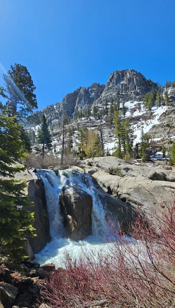 While last weekend we enjoyed an early spring ride over Ebbetts Pass, Sonora Pass offers its own breathtaking rewards. Snow still clings to the high ridges, and runoff from winter’s heavy snowpack means waterfalls, ice bridges, and snow-fed rivers are putting on an epic show.