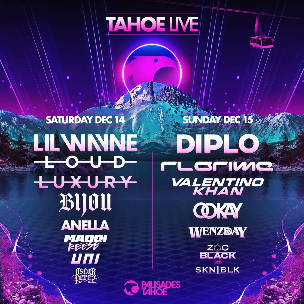 Olympic Valley, Calif. [November 5, 2024]— Tahoe Live is thrilled to unveil its complete lineup for the highly anticipated 2024 festival. Headlined by Lil Wayne, Diplo, Loud Luxury, and RL Grime, the festival will return for its third year on December 14 and 15, transforming Palisades Tahoe into a world-class winter music destination. Rounding out this stacked lineup are Valentino Khan, Bijou, Ookay, Wenzday, Anella, and Maddi Reese plus local talent UNI, Oscar Perez, and a b2b set with Zac Black and SKN, BLK, adding even more diversity and energy to this unforgettable event.