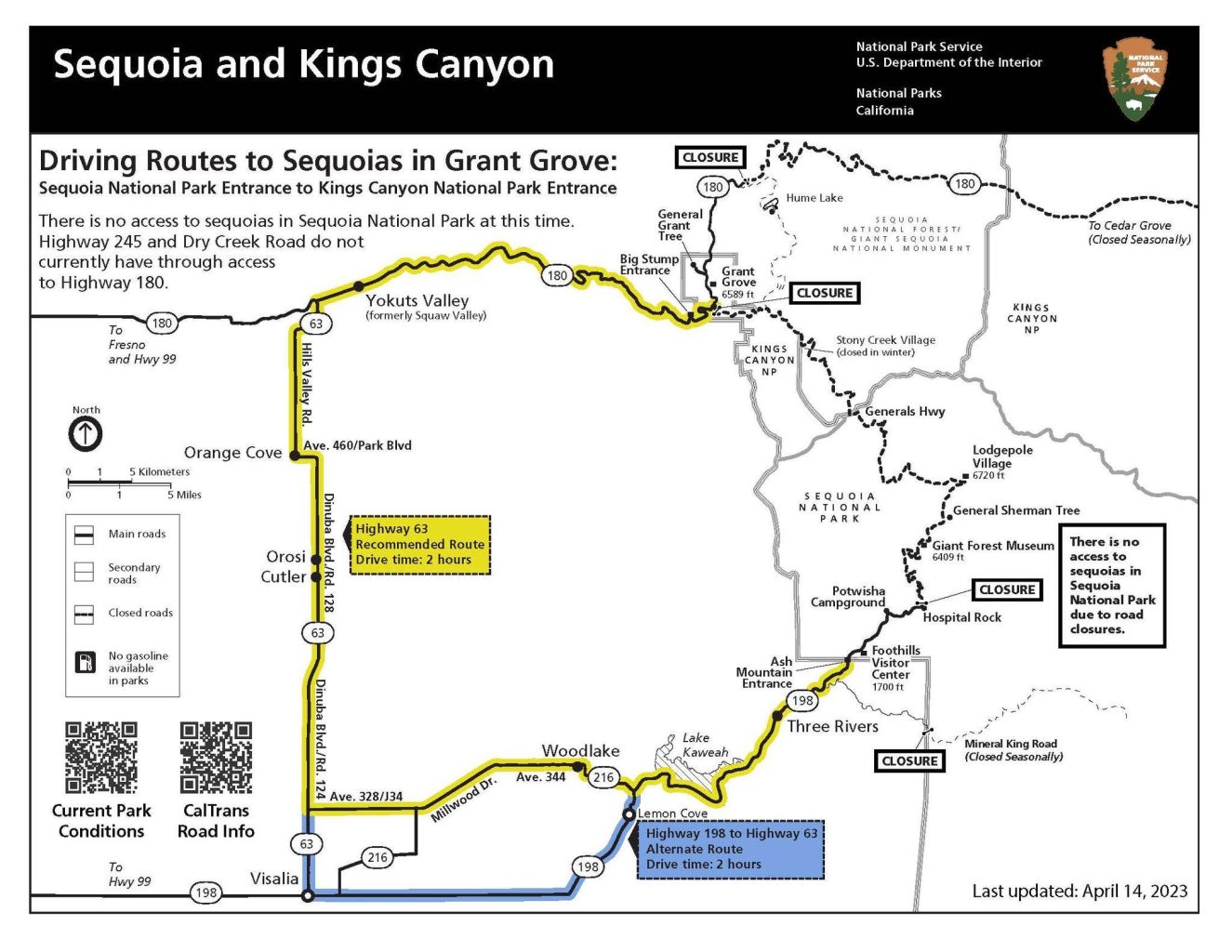 - Due to severe road damage along the Highway 180 corridor between Grant Grove and Cedar Grove, Caltrans does not expect repairs to be completed before the end of the summer season. This means public access is not expected into the Cedar Grove area of Kings Canyon National Park for the 2023 summer season.