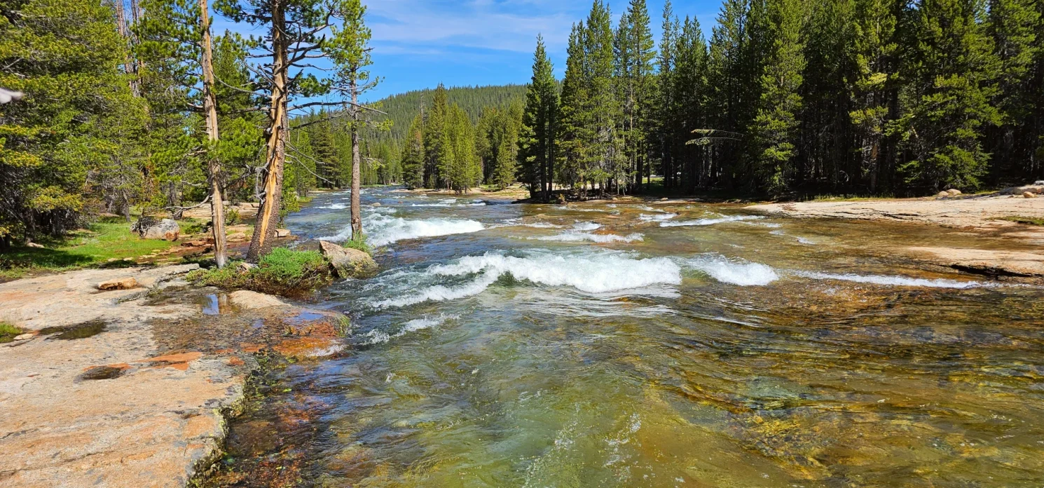 The Lyell fork of the Tuolumne is a glacier and snowpack feed river that is so clear and pure in the early season. The river is swollen at its banks, and the life of the river goes from rapids and water slide plunges to calm, meandering, deep pools along the route.