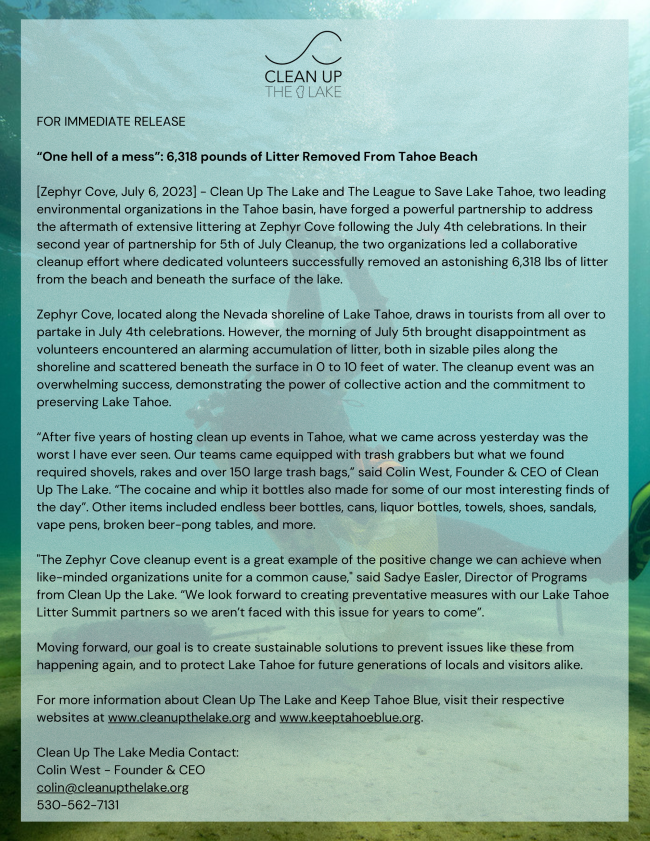 Another Sign of a Successful Partnership between Clean Up the Lake and the League To Save Lake Tahoe As they assemble to conquer the aftermath of the Fourth of July in Lake Tahoe