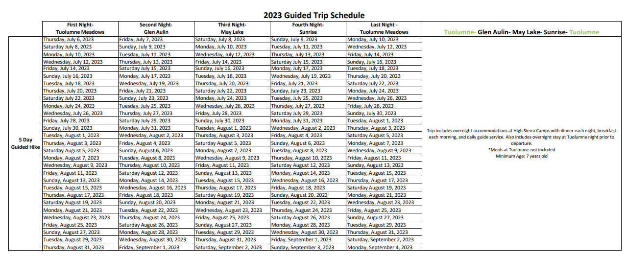 The Guided High sierra Camp experience incudes overnight stay in a shared canvas tent, breakfast, lunch, and dinner. 5-Day Guided Hike will include Tuolumne Meadows, Glen Aulin, May Lake, Sunrise, and Tuolumne Meadows. 5 day guided trips cost $792 per adult and $420 per child. the 2023 schedule for guided trips: